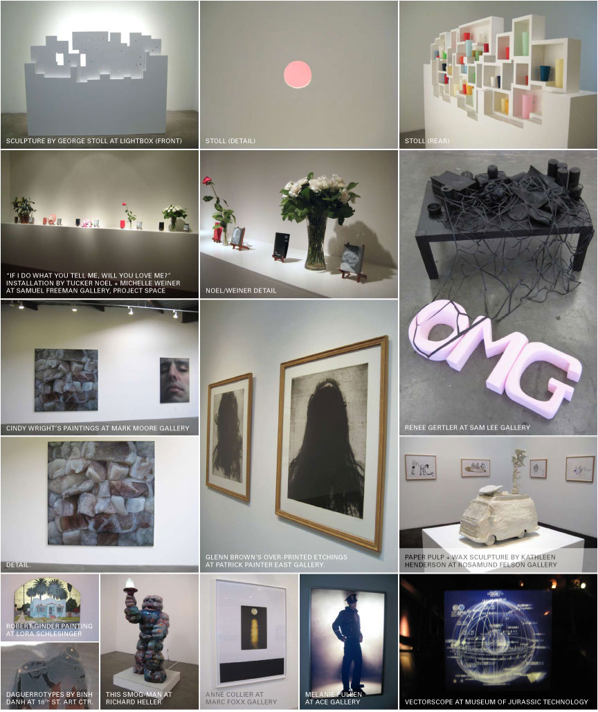 A fantastic show that counterbalances a surprisingly pointed emphasis on war and borders with utopic, phenomenological experiments. Curator Lauri Firstenberg pulled off a multi-site show featuring many excellent artists of color and women. I saw the museum show, the site of work by only about 30 of 50+ artists. I really enjoyed the work of Erica Vogt, whose small-scale projector-based installations were intimate reflections on media as framing devices. Mike Arcega‘s installation of two-by-fours looked great, and worked well sited near the port of Long Beach, as did Jebediah Ceasar’s 4x4x8’ polyurethane block. Anna Sew Hoy‘s site-specific sculptures for a dance performance were Isamu Noguchi-esque and a little cuddly. Justin Beal presented an intriguing installation of objects, furniture and wall-based works at the intersection of industrial production and war profiteering. Daniel Joseph Martinez‘ installation with an animatronic human figure was cold and discomfiting, effectively conjuring (for me) our complicity in acts of torture. Jordan Kantor and Mark Hagan both present satisfyingly odd, brainy paintings. (If commercial galleries only exhibited drawings and paintings as thought-provoking as Hagan’s and Kantor’s, gallery goers would be spared so much mediocre art!) Edgar Arceneaux‘s installation of shiny things, broken mirrors and haphazard projectors looked like a set for a Pink Floyd video, while his video reminded me of Politics of Rehearsal, Francis Alÿs’ show at the Hammer Museum. Arceneaux’s search for meaning seems highly provisional, reflecting the times’ uncertainty. In the same vein, I found Amanda Ross-Ho‘s excised studio walls — assemblages of found objects upon found marks — a little too totemic for my tastes, but I could appreciate the inward-looking search for authenticity, especially as institutions are crashing down all around us.