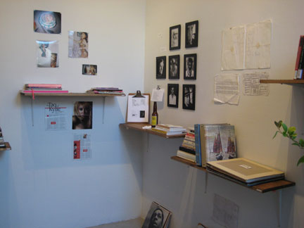 Kevin Killian’s altar to Kylie Minogue, with some books of poetry (left), Tom Marioni’s inspirational photos of artists (center) and Colter Jacobsen’s objects, which included photo albums (right).