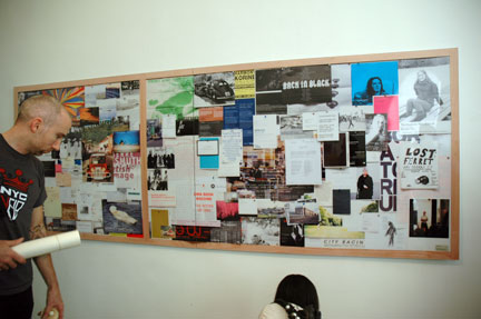 Here’s an interesting project: artist Joseph Grigely is interested in ‘exhibition prosthetics,’ the collateral involved in making and marketing exhibitions. Here, he presented a photograph of a bulletin board. (Teaser: It’s not unlike a sight you might see in Shadowshop, Stephanie Syjuco’s emporium of artists’ wares at SFMOMA, to which I’ve contributed multiples.)