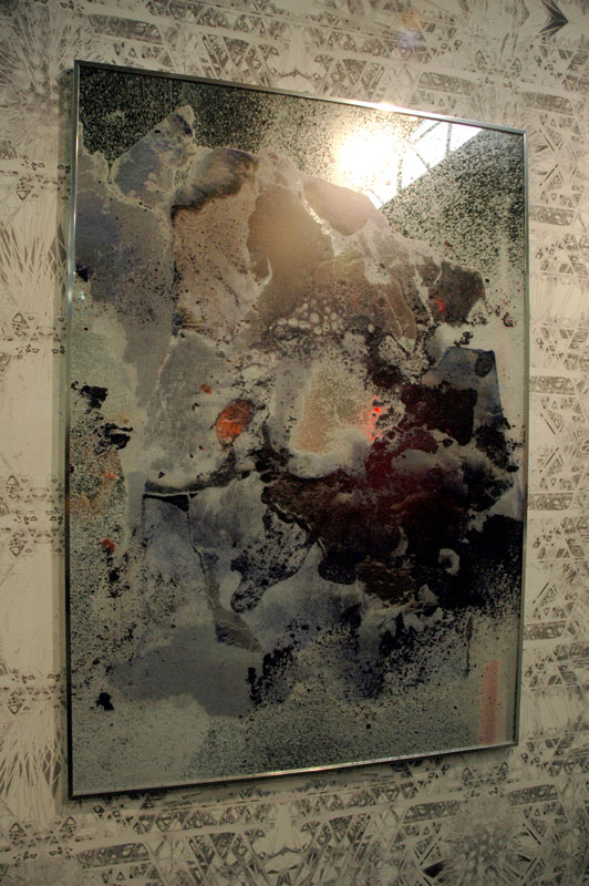 Mirrors with images, possibly direct-to-substrate printing; it’s got that pebbly sheen. I couldn’t figure out who this is. Rashad Newsome, maybe? Marlborough Gallery, Chelsea, NY.