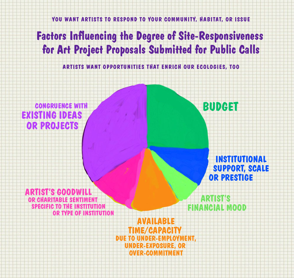 Site-specific calls are especially labor-intensive, so perhaps savvy artists embrace degrees of site-responsiveness. These are some factors that influence to what degree I push speculative projects. Enjoy.