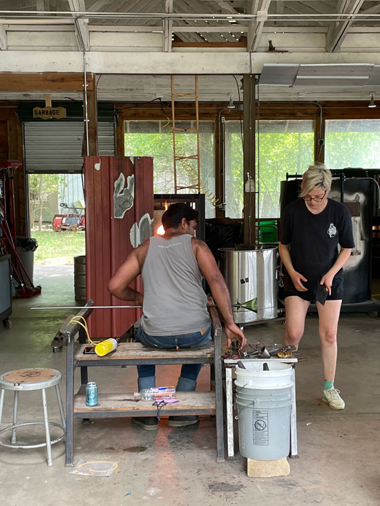If that wasn’t enough, at Ox-Bow, I had the chance to be a practitioner for a few hours and access a studio I never usually have access to. I got to blow glass for the first time since undergrad, which is over 20 years ago. I’ve been wanting to blow glass for years, especially the past few years as I’ve gotten more connected with glass artists and institutions. But the opportunity to blow glass never presented itself. Finally, I worked up the nerve to mention my interest to staff, and glass studio head Nick Clayton very generously devoted a morning to a private tutorial. Many aspects and movements came back to me, but many things did not. It was humbling, hilarious, and tons of fun! Blowing glass was a peak experience in a week full of peak experiences. I’m so grateful to Nick and to Ox-Bow. Many art studios are not set up for an individual not enrolled in a class to be able to handle molten glass and red-hot metals. But at Ox-Bow there’s an extraordinary willingness to trust artists, and to take risks as part of generosity in support of fellow artists.