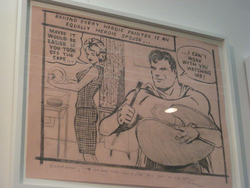 A second look: Lots of pictures, including some glorious Mad Men meets Flintstones installations. Colorful, ironic, likable pathetic-aesthetic. I can see why this work would be popular, in a Judd Apatow sort of way. Tongue-in-cheek tropes of male identity means you can have your bar cart and wink-wink humor too.