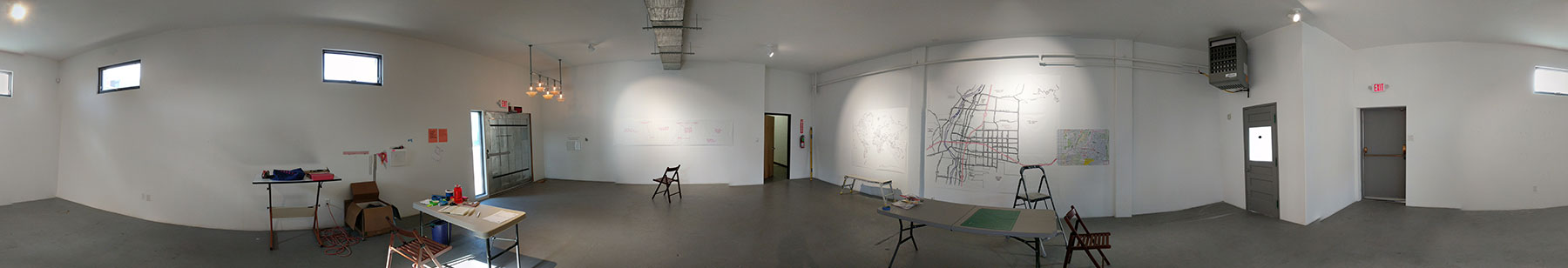 The gallery/studio: My project was not studio-oriented, so it sometimes felt like an embarrassment of riches to have a 1,100-square-foot gallery to work in. I was grateful, though, to address the gallery early on, when I had more slack time as I was waiting for submissions to come in. I drew oversized maps and hand-lettered questions for a response wall. The public could interact with them at an artist’s talk in the beginning of the residency, as well as throughout the exhibition following the residency. This was helpful since a major component of my project was located at various sites around town.