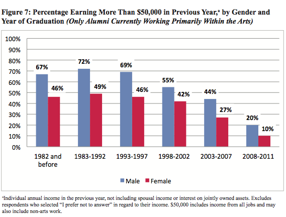the income gap between male and female arts alumni persists regardless of how long ago they graduated from their institutions