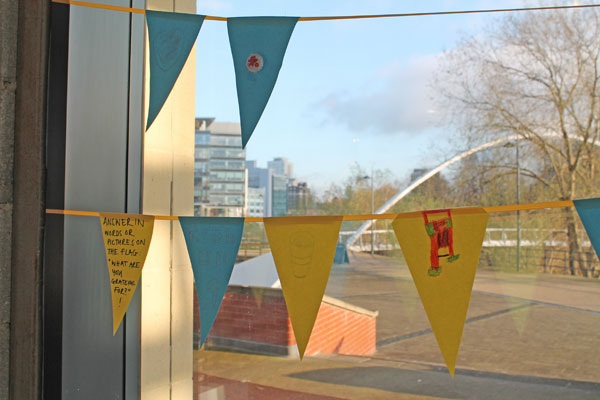 Give Thanks (installation detail at Untitled Gallery / Project Space Leeds), 2011, installation of 39 flags: satin ribbon, linen, gratitude statements; dimensions site-variable; each flag 12 x 18 in / 30 x 45 cm. Photo: Katie Rutherford/Untitled Gallery, Manchester, UK.