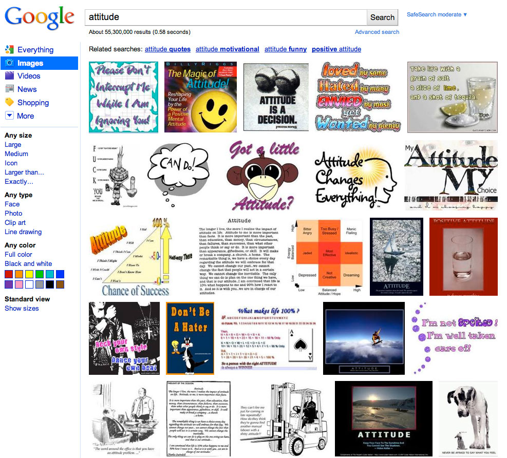 I love the mix of results! Trashy, jokey mottos alongside sincere (if simplistic) mantras for optimism. Just the first row is brilliant: unapologetic crudeness underscored by a sassy type treatment, self-help clichés (positive thinking, magic, happy face), motivational sports maxims, more unapologetic crudeness plus sexual egomania, and a party-goer’s mantra. It sort of exemplifies American ignominy as well as the desire for inspiration and the futility of oversimplified positive thinking. It presents lowbrow poles of irony and sincerity.